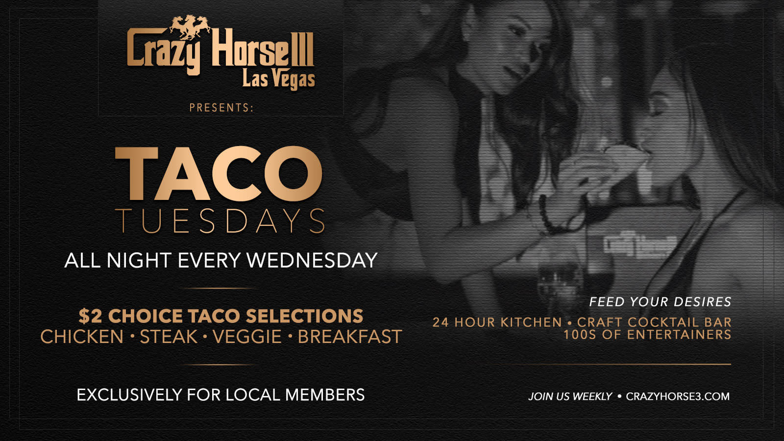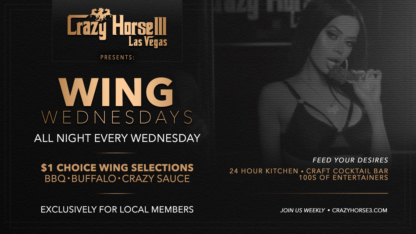 Wednesdays get saucy at Crazy Horse 3! Feed Your Desires with $1 wings, all night long. Take your pick of BBQ, Buffalo or our secret Crazy Sauce and keep the it flowing with ice-cold drinks and your favorite CH3 Girl. Don’t miss the chance to save on packages online — the perfect combo of wings, drinks, and CH3 entertainment.